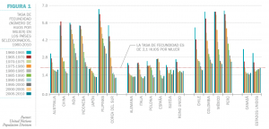 “En más de 75 países, la tasa de fecundidad está muy por debajo del nivel de reemplazo —2,1 hijos por mujer— necesario para mantener la mano de obra en los niveles actuales”, destaca; y pone como ejemplo el estancamiento económico de Japón por su déficit de natalidad originado en los años setenta del siglo pasado; y la caída del índice de fecundidad en China en los posteriores años noventa.