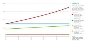 Por el contra, la población de 0 a 4 años se mantendrá al nivel actual en los países desarrollados y tenderá a la baja en los países en desarrollo.