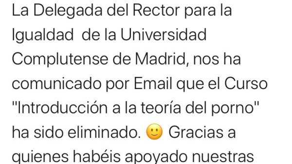 La Universidad Complutense de Madrid ha suspendido el seminario Una introducción a la teoría del porno después de las protestas de sus propias estudiantes y de la Asamblea Abolicionista de Madrid Compartir en X
