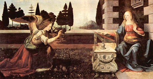 Leonardo da Vinci, pintó una Anunciación que se encuentra en los Uffizi, en Florencia. En la entrada de una suntuosa mansión, la Virgen está leyendo un libro sagrado apoyado sobre un suntuoso atril decorado con volutas y pechinas, la Virgen parece algo asustada por la visita repentina del arcángel, que de rodillas delante de ella, apoyándose en un manto de hierbas y flores, le anuncia la buena noticia, y la bendice con la mano derecha, sosteniendo el lirio en la mano izquierda.
