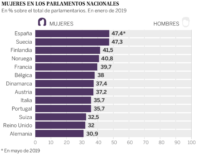 España tiene un 47,4% de mujeres frente al resto que son hombres. Le siguen Suecia (47,3%), Finlandia (41,5%), Noruega (40,8%) y Francia (39,7)%). Otros países como Italia o Portugal, bajan hasta el 35,7%; y algunos no llegan ni a una tercera parte de los escaños. Por ejemplo, Luxemburgo (25%) o Irlanda (22,2%).
