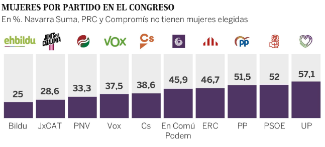 ERC, por ejemplo, llega hasta el 46,66% y Em Comú Podem hasta el 42,85% de congresistas. Por debajo del 40% quedan Ciudadanos, Vox, PNV, JxCAT y Bildu. Navarra Suma, el Partido Regionalista de Cantabria y Compromís, que han conseguido 2, 1 y 1 escaño respectivamente, tendrán un 0% de mujeres en sus asientos en la Cámara baja. Y Coalición Canaria, el 100%: sus dos escaños lo ocuparán dos mujeres: Ana Oramas y Guadalupe González.