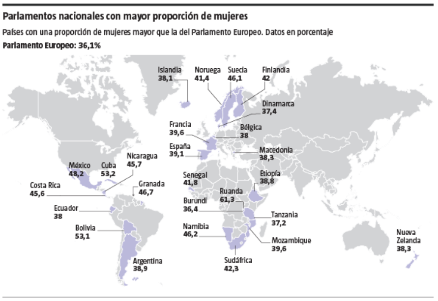 En el siguiente gráfico esa comparativa se puede extender al resto del mundo y en parlamentos nacionales donde España presenta un 39,1% de parlamentarias, Argentina el 38,9%, México el 48,2%o Sudáfrica el 42,3%.