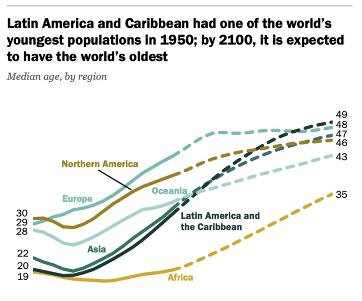En 1950, la edad media de la región era de 20 años. Esa cifra se proyecta a más del doble, a 49 años, para el año 2100, dice el estudio.