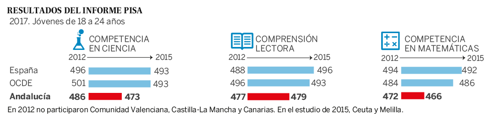 La comprensión lectora mostraba estos resultados: en Andalucía, 479 puntos en 2015, dos puntos más que en 2012, pero muy alejada de la media española (496) o la de la OCDE (493).