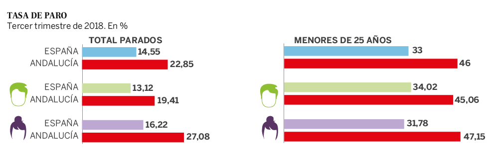 En cifras globales, con datos de la Encuesta de Población Activa (EPA) de septiembre de 2018, hay 898.000 desempleados en Andalucía, y más de 300.000 hogares tienen a todos sus miembros en paro.