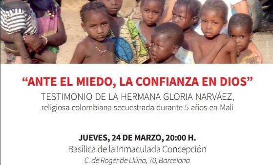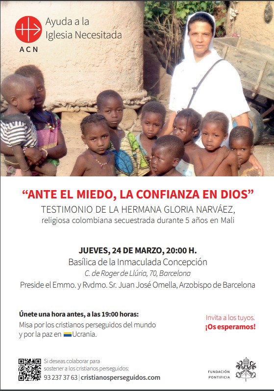 Ayuda a la Iglesia Necesitada convoca, el jueves 24 de marzo, a las 20:00 h, en la Basílica de la Concepción (c/ Roger de Llúria, 70, Barcelona), a un acto en el que la Hna. Gloria Narváez, dará su testimonio de lo vivido durante su secuestro en Mali.
