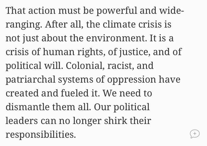 El 29 de noviembre Greta Thunberg publicaba un artículo titulado Why We Strike Again («Por qué atacamos de nuevo», en castellano) firmado por otras dos personas en el que afirmaba: «La crisis climática no trata solo de medioambiente: la han creado los sistemas de opresión coloniales, racistas y patriarcales». Y añade: «Necesitamos desmantelarlos a todos. Nuestros líderes políticos no pueden eludir durante más tiempo sus responsabilidades»: