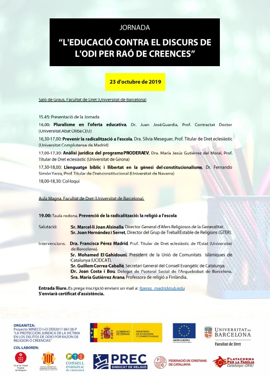 L’objectiu d’aquesta Jornada, és plantejar des de la perspectiva del Dret i de les diferents comunitats religioses, com combatre amb l’educació el discurs de l’odi per raó de creences.