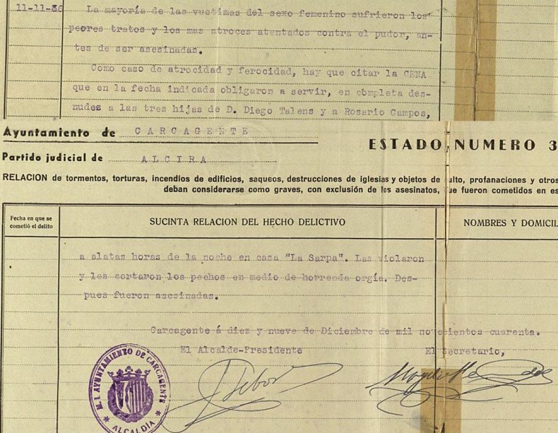 En el folio 7 se da por asesinadas a las hermanas Giner en días distintos (13 y 14) y a Juan Gonga el día 12; todos en Benifairó. Cinco de las mujeres asesinadas junto a él fueron violadas y les cortaron los pechos en una cena y orgía sobre las que se dan detalles en los folios 10 y 11: