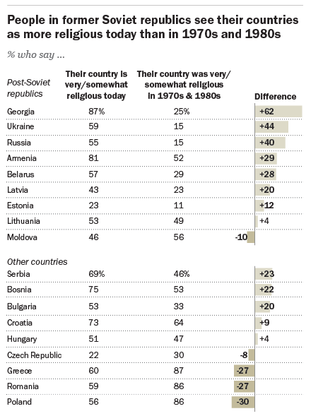 “Con pocas excepciones, en las ex repúblicas soviéticas la opinión más común es que esos países son más religiosos que hace unas décadas. Sólo el 15% de los rusos, por ejemplo, dice que su país era ‘muy religioso’ (3%) o ‘algo religioso’ (12%) en los años setenta y ochenta, mientras que el 55% dice que Rusia es muy (8%) o un poco (47%) religiosos hoy”.