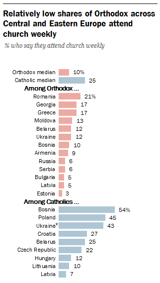 Por ejemplo, “el 45% de los católicos de Polonia dicen que asisten al culto por lo menos una vez por semana, más del doble de los cristianos ortodoxos de cualquier país encuestado que dicen ir a la iglesia con frecuencia”, como se ve en este gráfico.