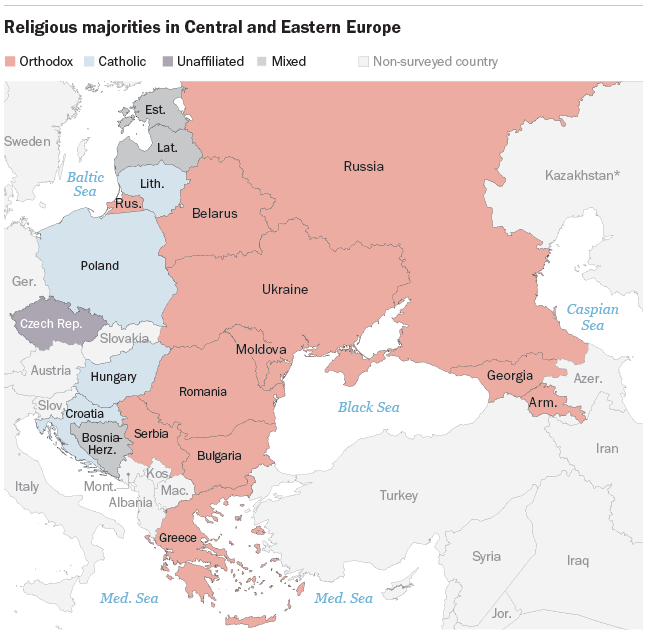 Para el Pew Research Center, otra forma de plantear la cuestión es relacionar las diferentes tendencias en los países predominantemente ortodoxos y católicos como “un reflejo de la geografía política: los países ortodoxos de la región están más hacia el este, y muchos eran parte de la Unión Soviética. Los países católicos están más hacia el oeste, y sólo Lituania era parte de la URSS”.