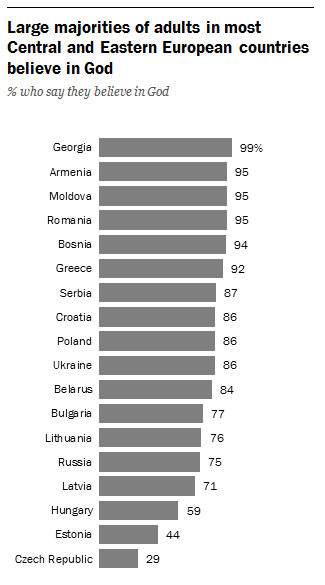 El Pew Research Center concluye que “en general, es menos probable que las personas de Europa central y oriental digan que creen en Dios que los adultos previamente encuestados en África y América Latina, entre quienes la creencia es casi universal. Sin embargo, a través de esta región -con su historia única de apoyo al estado de ateísmo y separación de la religión de la vida pública- es sorprendente que la gran mayoría de los adultos expresan la creencia en Dios.