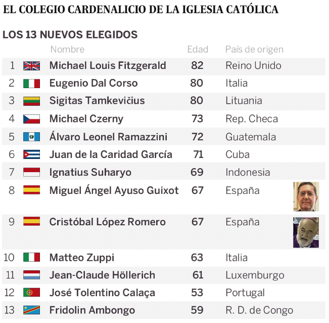De entre los 13 nuevos cardenales creados dos son españoles, el obispo español y también misionero nacido en Sevilla, Miguel Ángel Ayuso Guixot, que es el máximo responsable del Diálogo Interreligioso del Vaticano; o el actual arzobispo de Rabat, el también español Cristóbal López Romero, nacido en Vélez-Rubio (Almería).