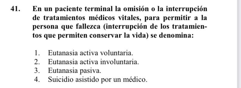 En ese sentido se dirigió la pregunta número 41 del examen del MIR, que planteaba lo siguiente: «En un paciente terminal la omisión o la interrupción de tratamientos médicos vitales, para permitir a la persona que fallezca (interrupción de los tratamientos que permiten conservar la vida) se denomina:» y se ofrecían cuatro posibles respuestas: «Eutanasia activa voluntaria», «Eutanasia activa involuntaria», «Eutanasia pasiva», o «Suicidio asistido por un médico».