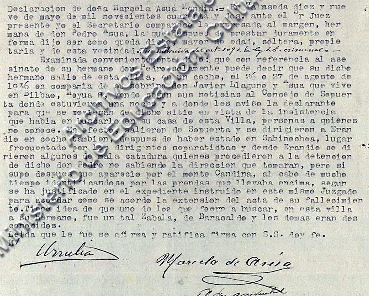 «Su dicho hermano salió de esta villa, en un coche, el 26 o 27 de agosto de 1936 en compañía de su sobrino don Javier Llaguno y Asúa, que vive en Bilbao, Moyua 8, yendo según sus noticias al Concejo de Sopuerta donde estuvieron una noche y a donde les avisó la declarante para que se movieran de dicho sitio en vista de la insistencia que había en buscarlo en su casa de esta Villa, personas a quienes no conoce. En efecto, salieron de Sopuerta y se dirigieron a Erandio en coche también, después de haber estado en Sabinechea, lugar frecuentado por los dirigentes separatistas y desde Erandio se dirigieron algunos de mala catadura quienes procedieron a la detención de dicho don Pedro no sabiendo la dirección que tomaran, pero sí supo después que apareció por el monte Candina».